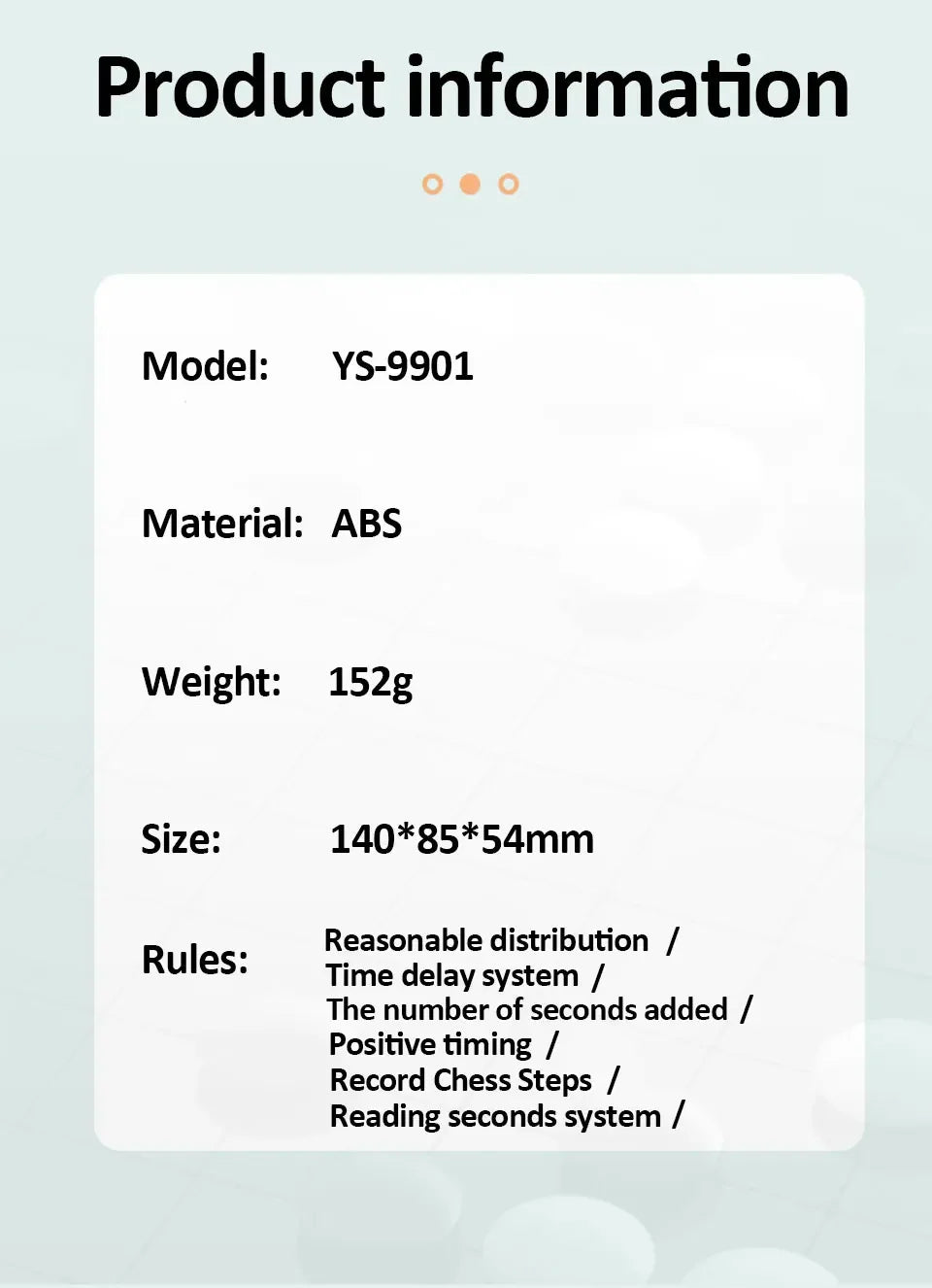 SPECIFICATIONSBattery Included: NoBrand Name: NoEnName_NullChoice: yesFeature: MultipurposeHigh-concerned chemical: NoneItem Type: Professional Chess Clock,Digital Chess TimerModel Number: YS9901/YS902Origin: Mainland ChinaTheory: DigitalUse:...